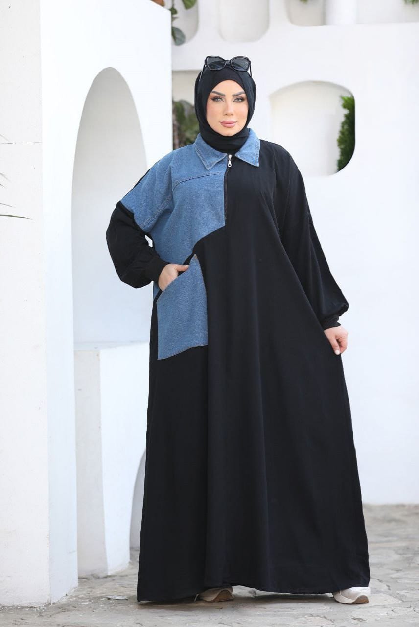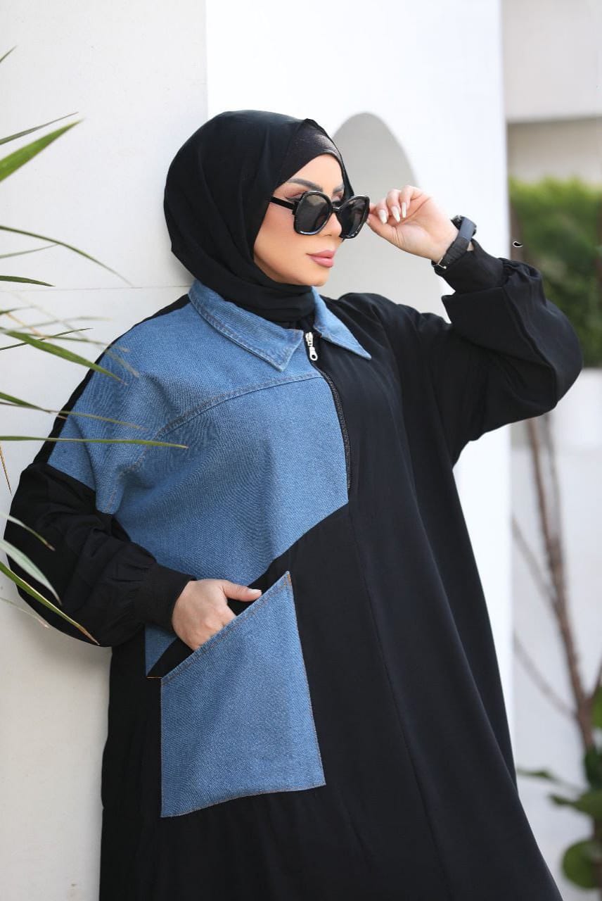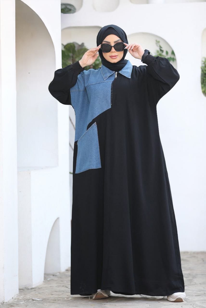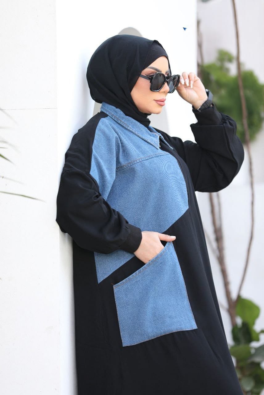 عباية شيك بتصميم بسيط ومريحمصنوعة من رويال كريب فورمال مع جينز رباعي تجمع بين الشكل الأنيق والراحة في اللبس. ستايل موديست...