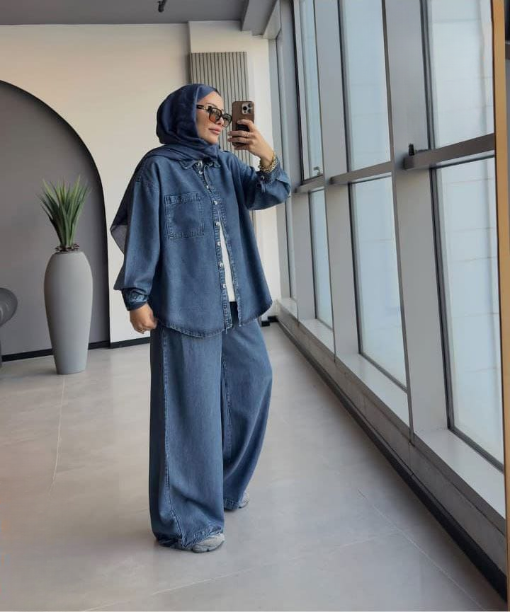 طقم متكامل وعملي مكون من شميز جينز مع بنطلون وأندر شيرت لإطلالة شيك بدون مجهود!