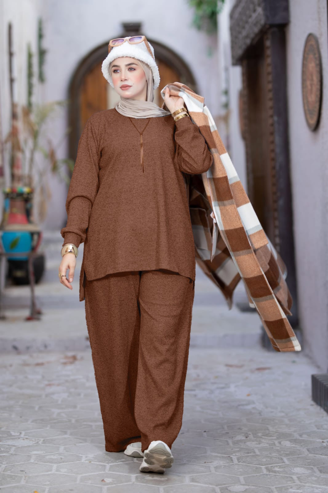 سترة صوفية منقوشة بحزام وجيبين، مع بدلة ناعمة مضلعة من قطعتين مزيج مثالي من الأناقة والراحة والأناقة اليومية