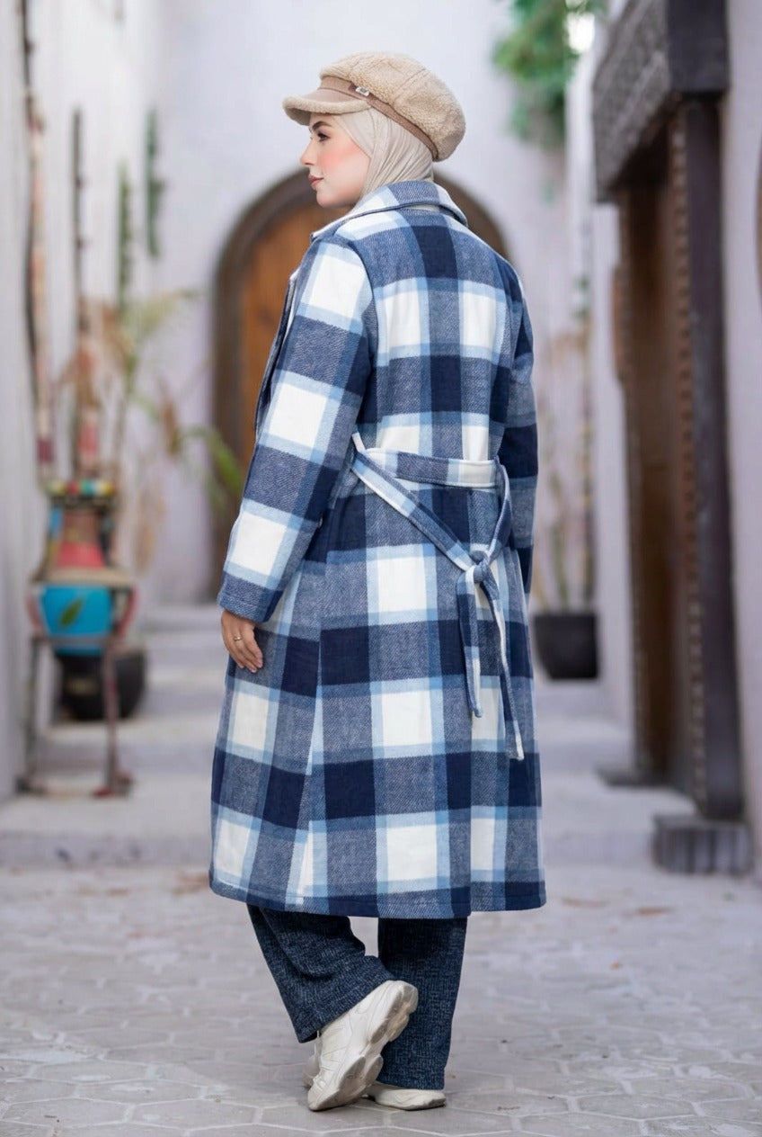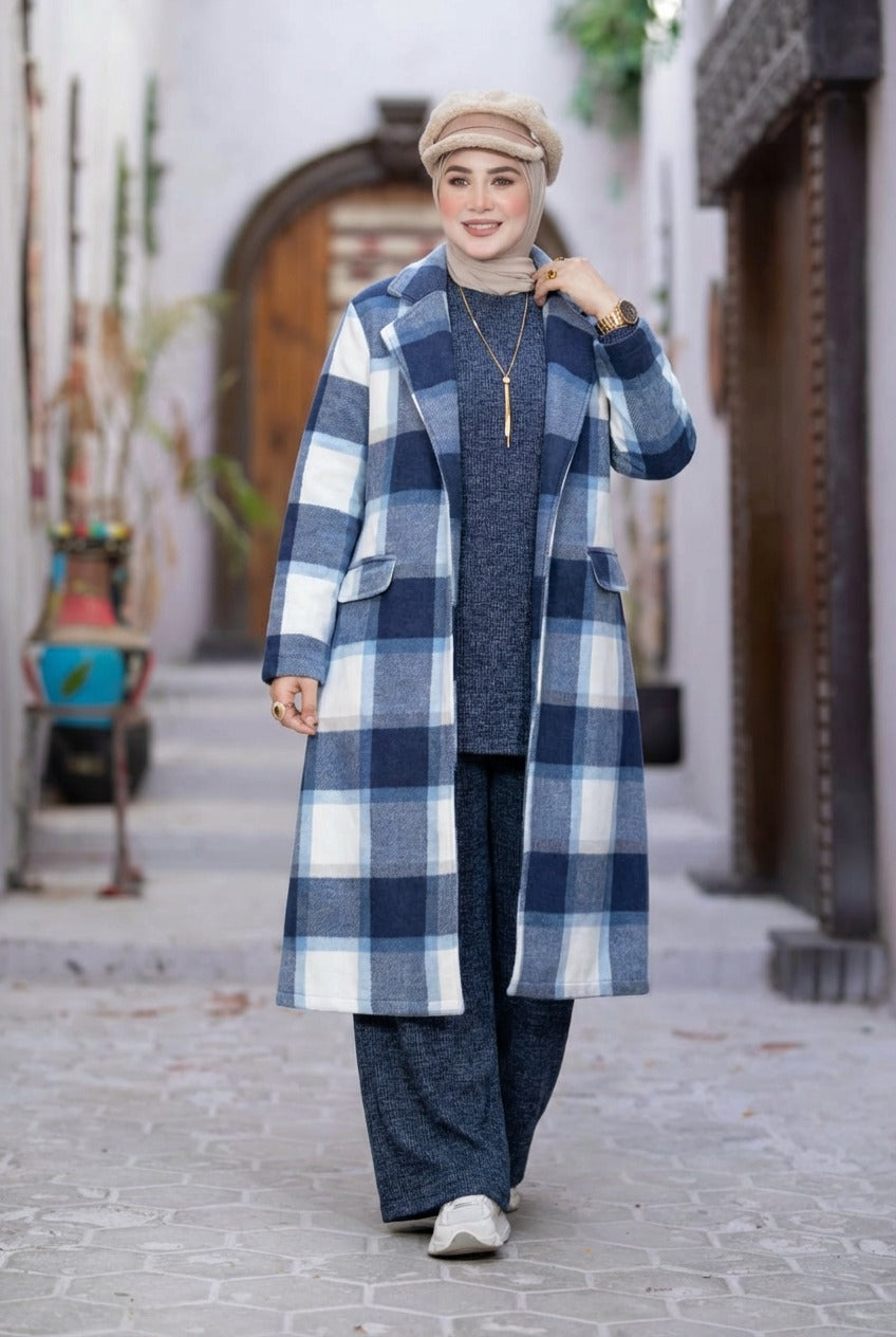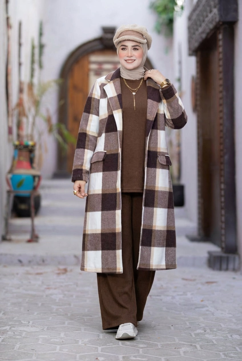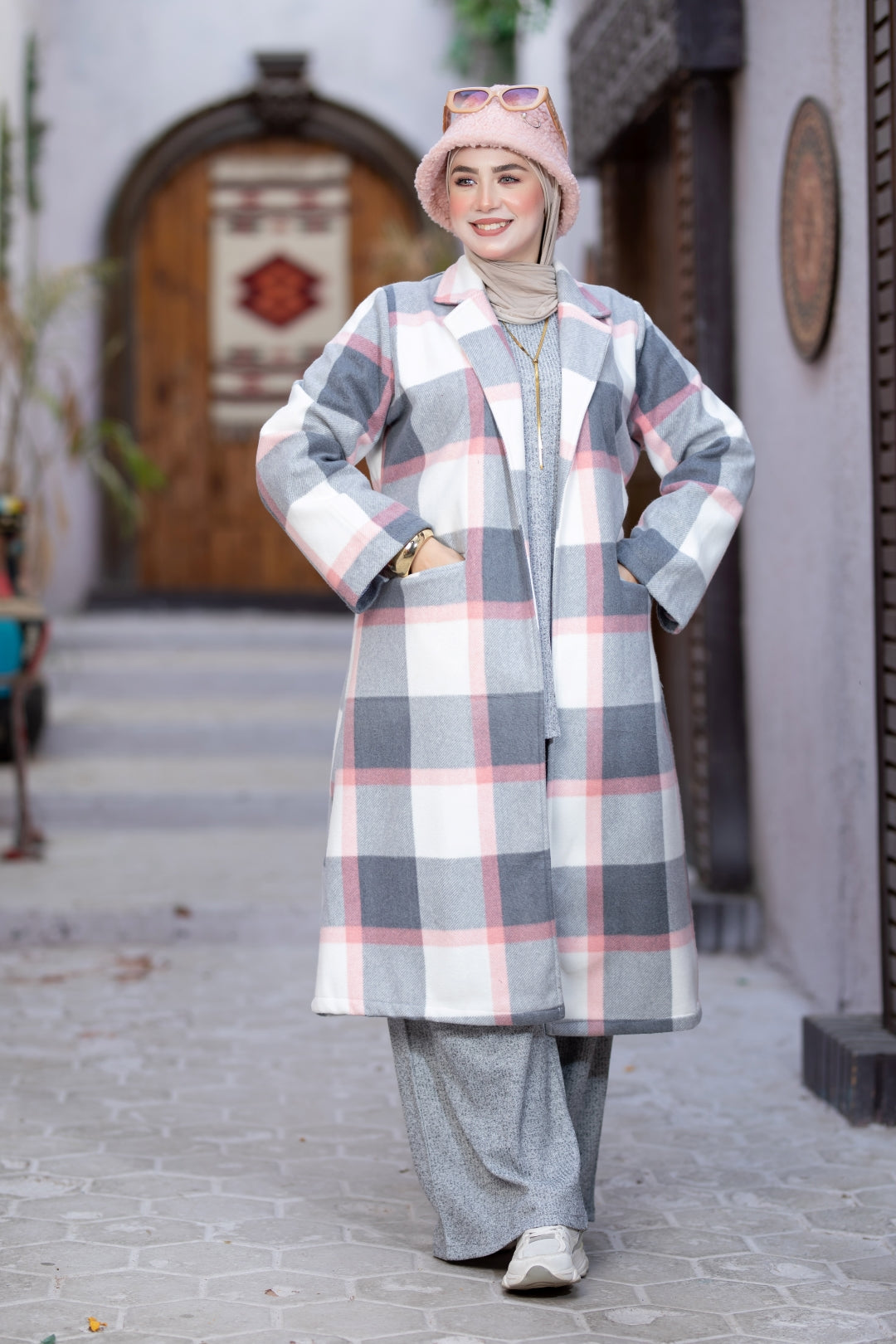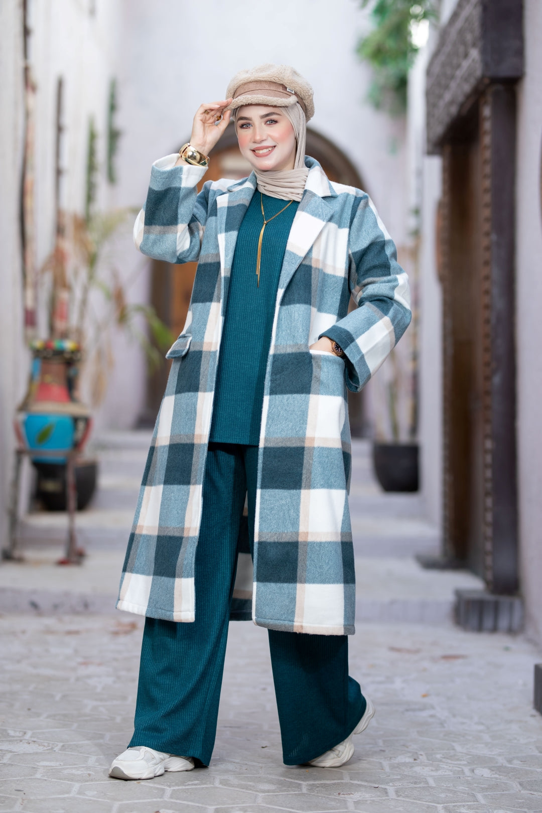 A checkered wool jacket with belt & 2 pockets, paired with a soft ribbed 2-piece suit A perfect mix of...