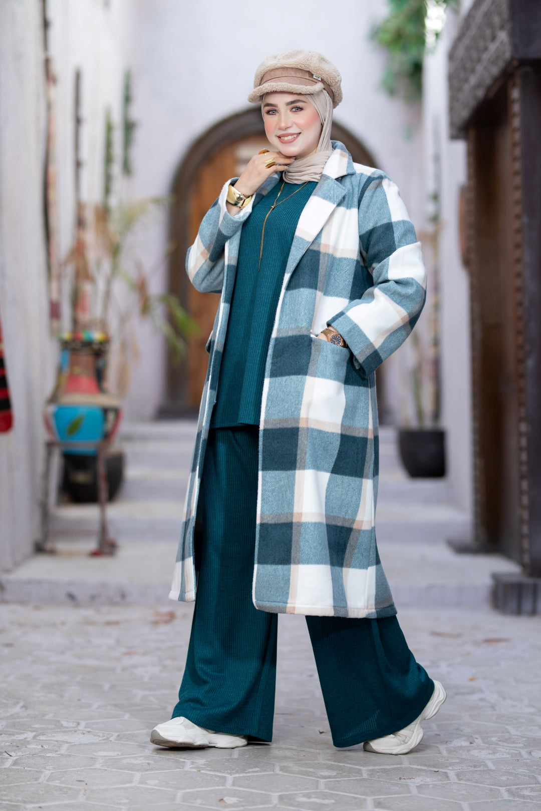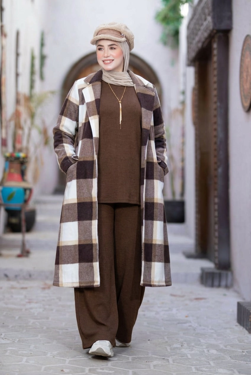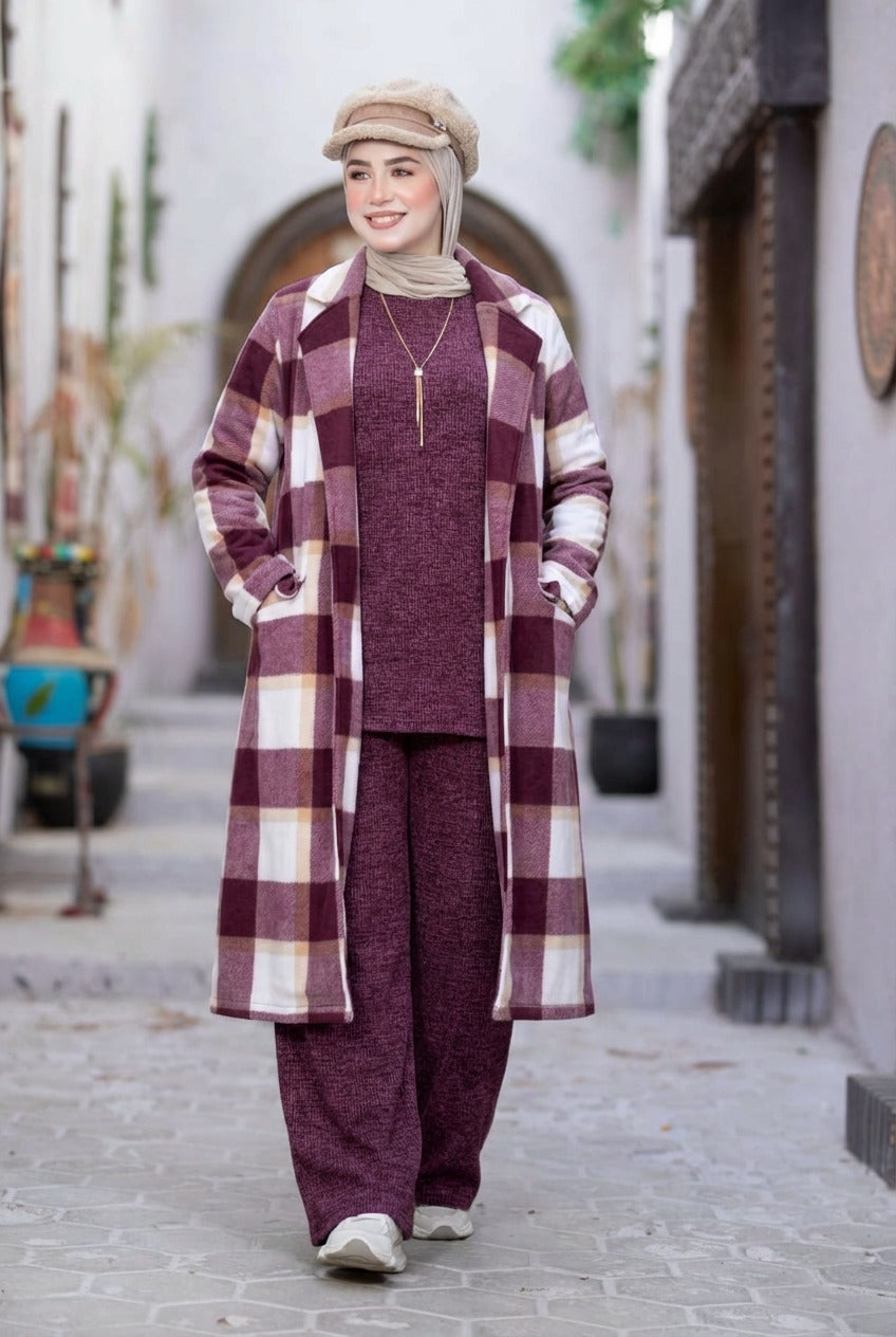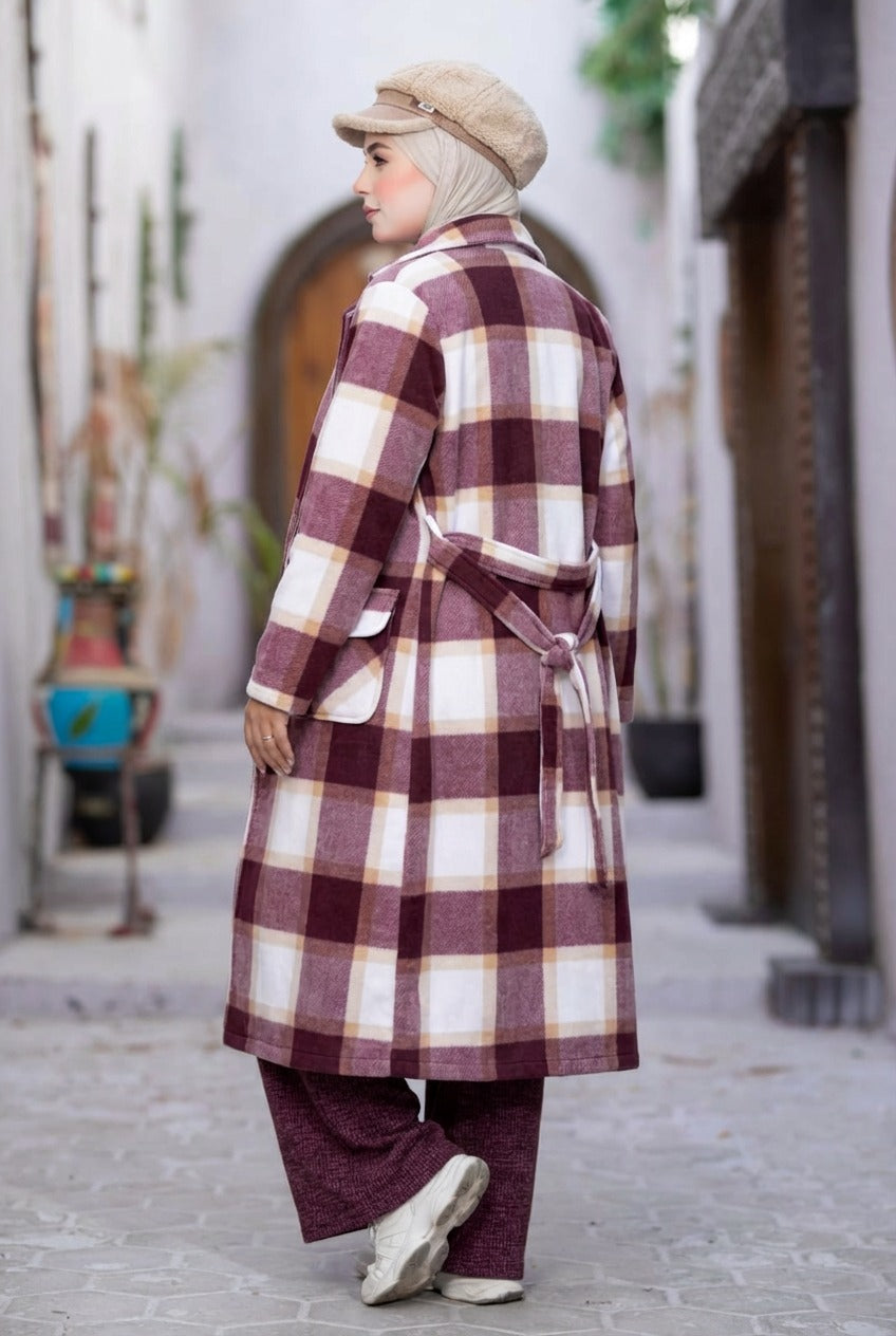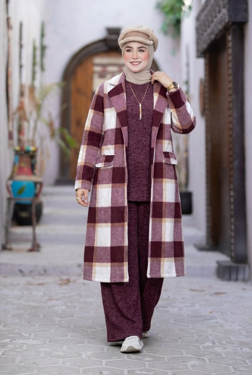 A checkered wool jacket with belt & 2 pockets, paired with a soft ribbed 2-piece suit