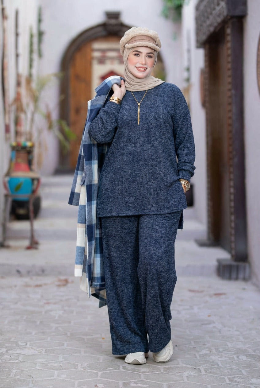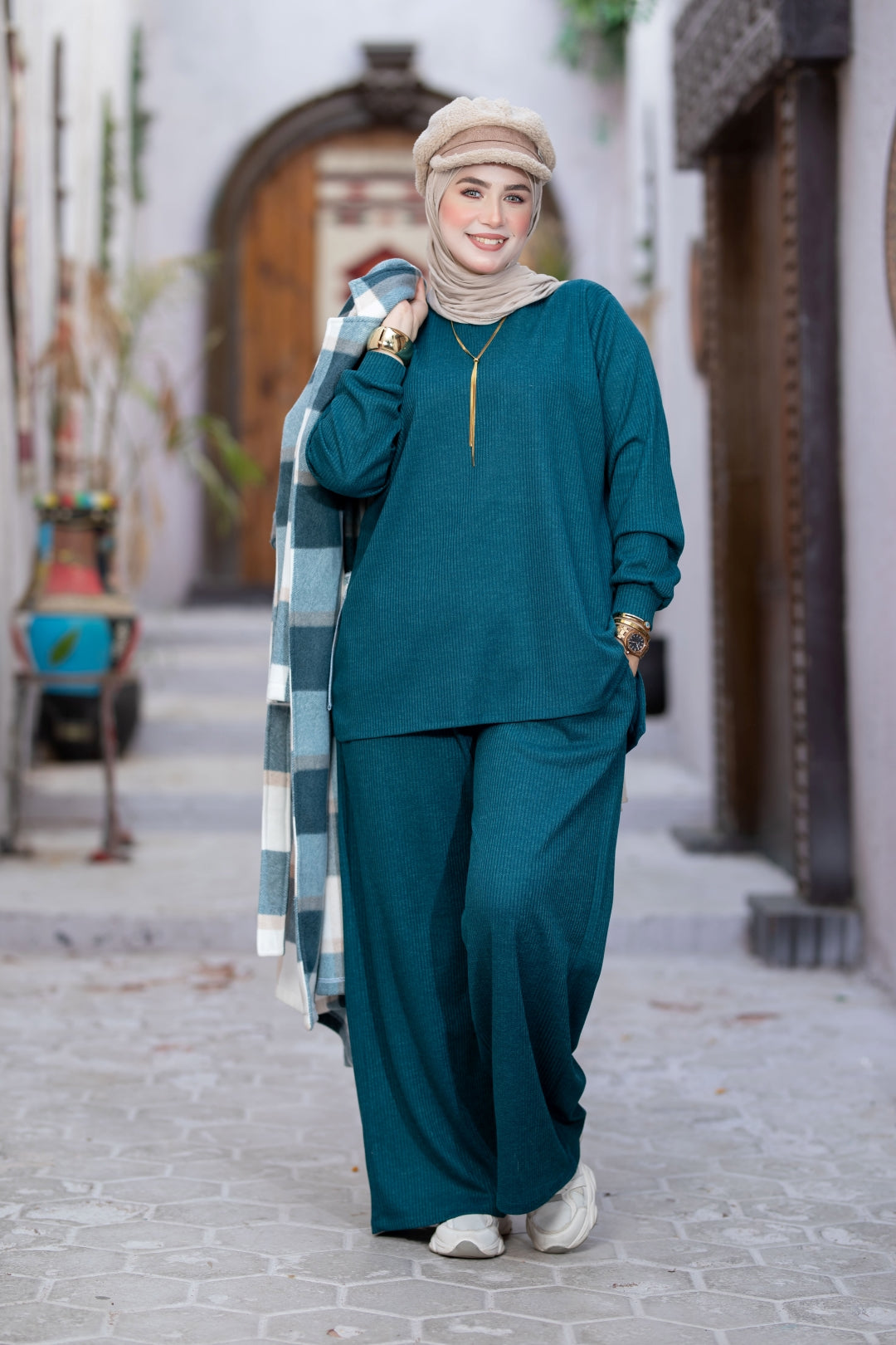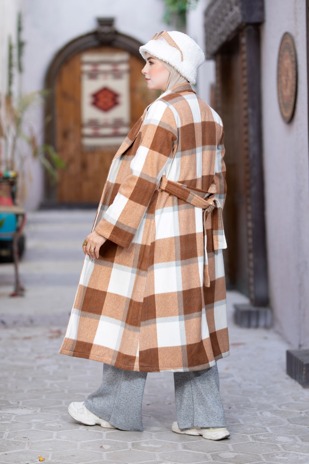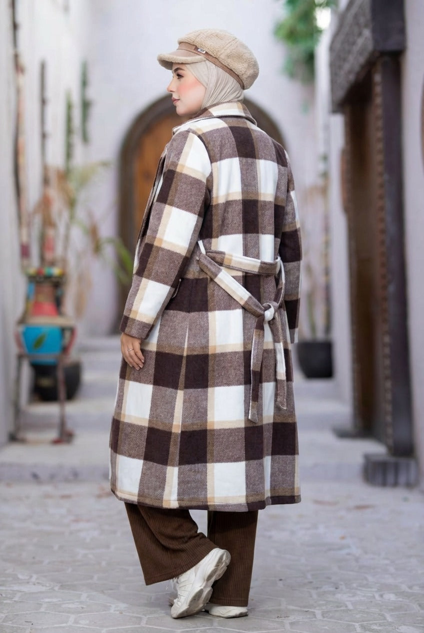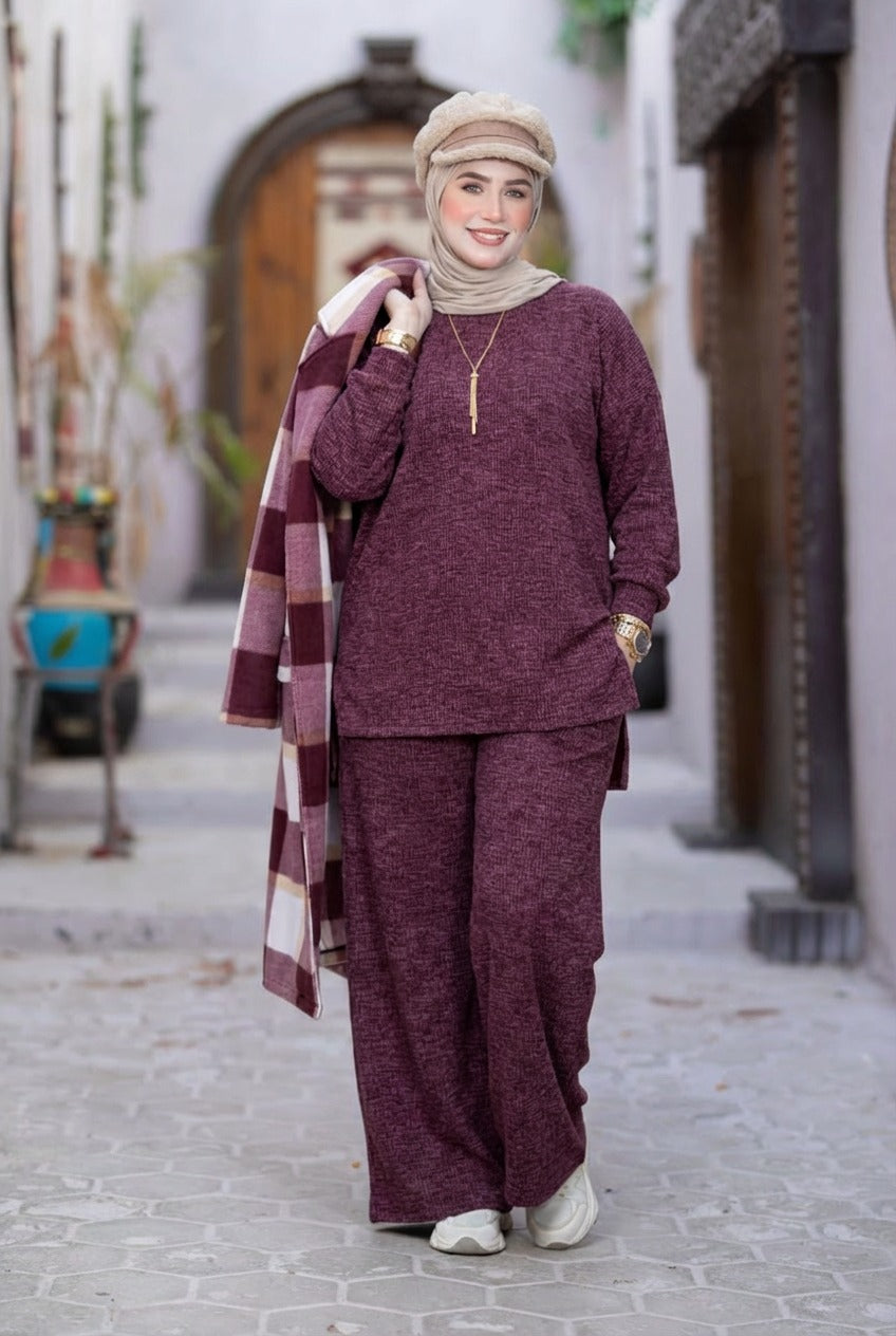A checkered wool jacket with belt & 2 pockets, paired with a soft ribbed 2-piece suit