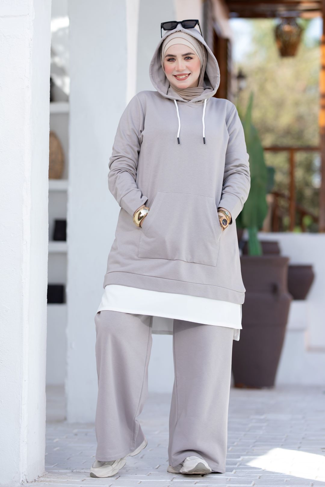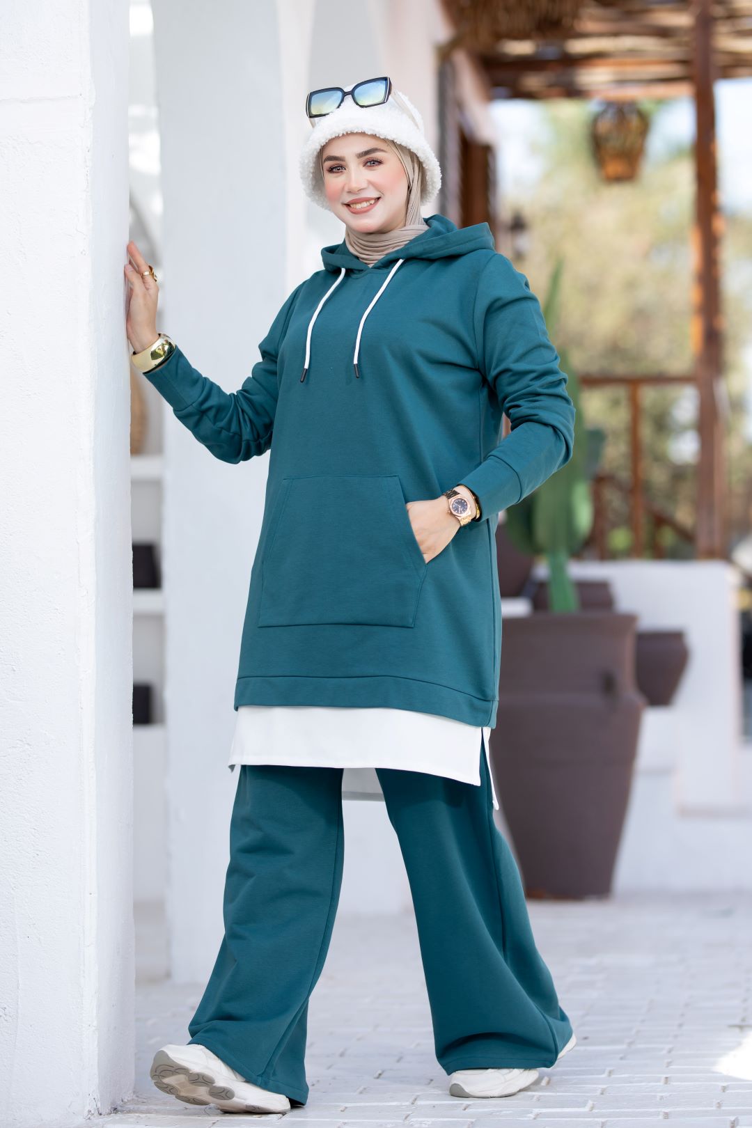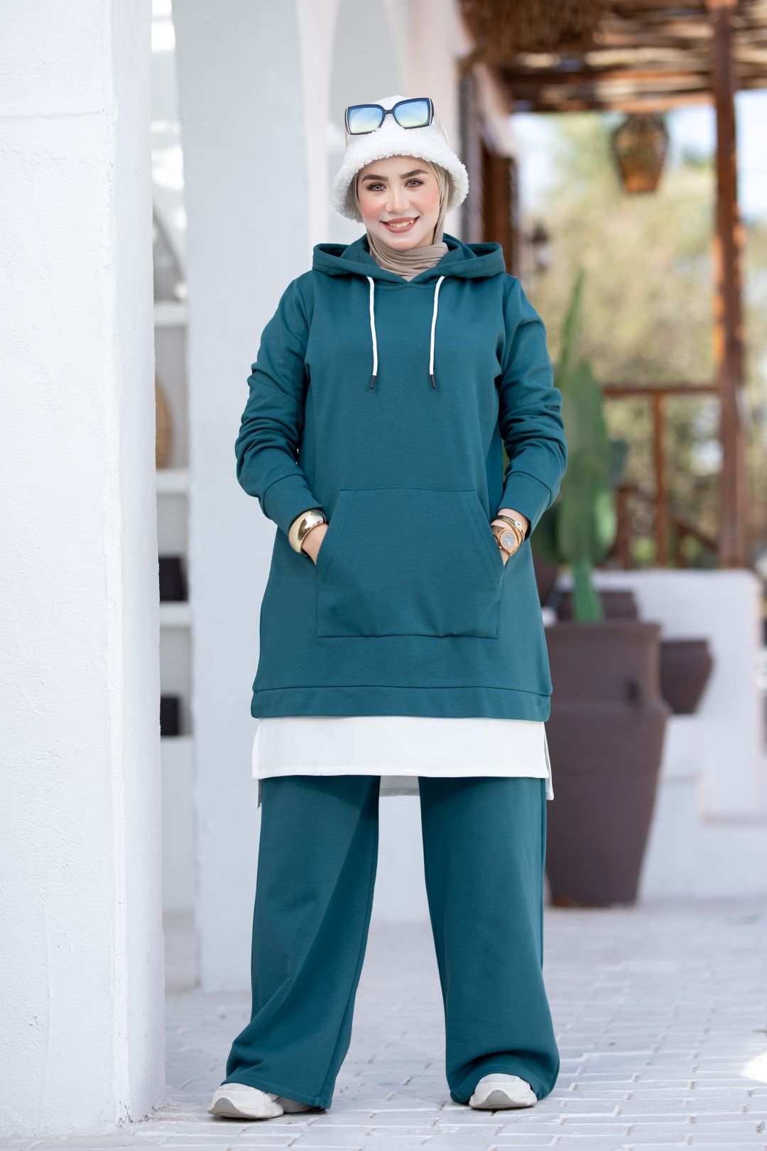 Features a hooded shirt with kangaroo pocket and matching pants for a sleek modern look