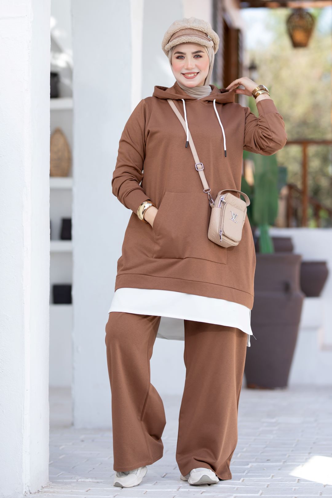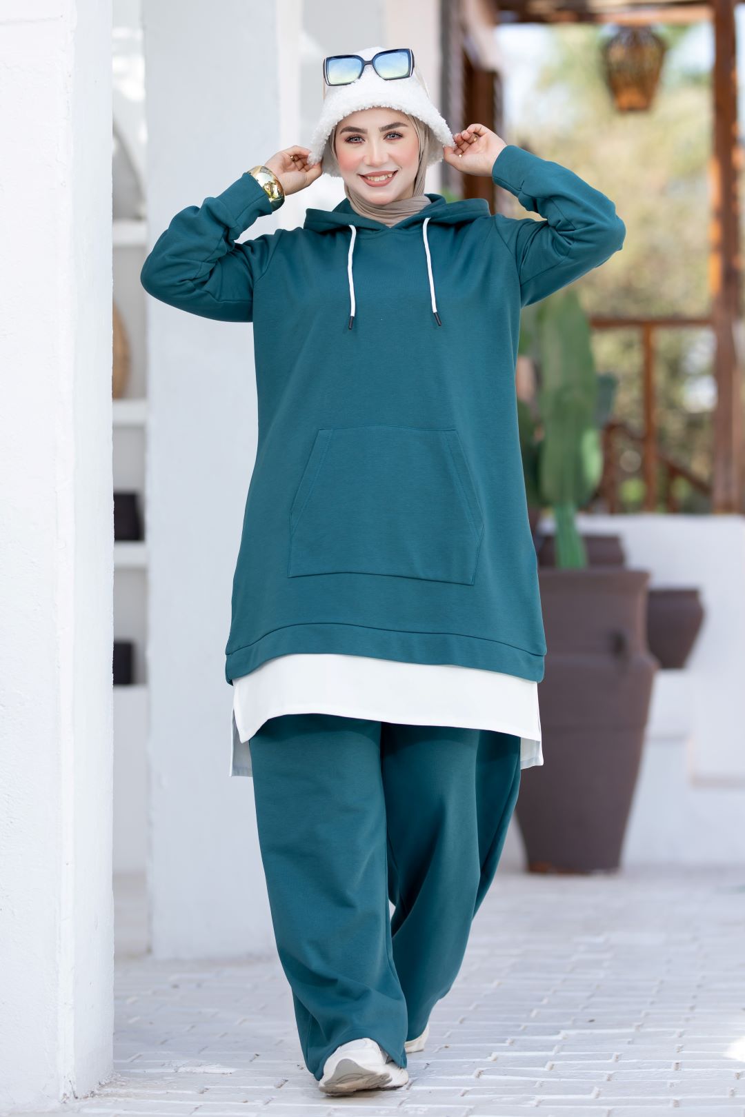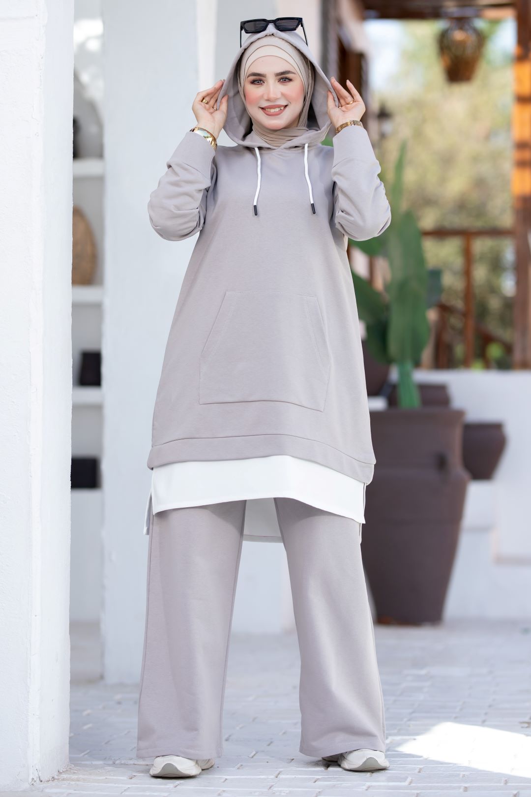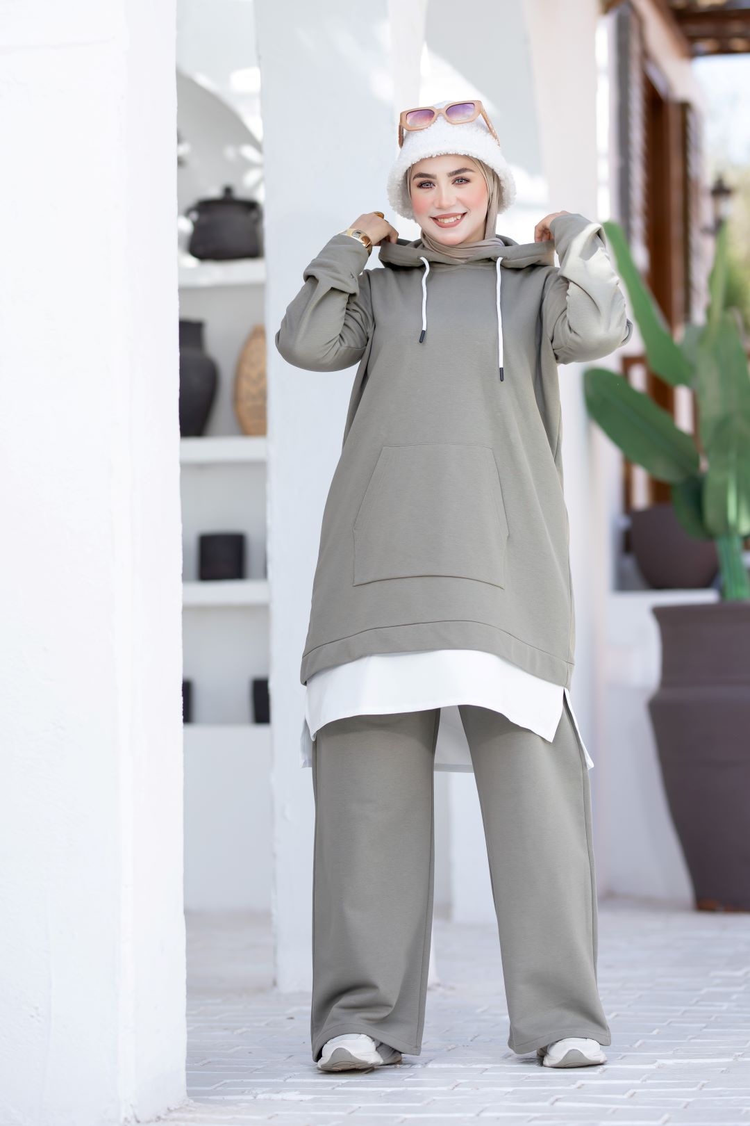 Features a hooded shirt with kangaroo pocket and matching pants for a sleek modern look